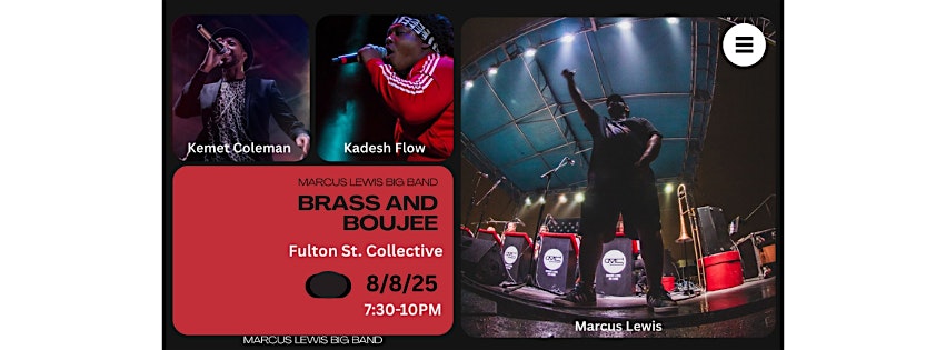 Fulton Street Collective presents a performance with Marcus Lewis Big Band BRASS & BOUJEE on Friday, August 8th at 7:30pm
