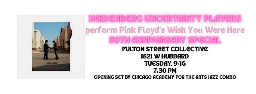 The evening will feature live painting from visual artist TBAHeisenberg Uncertainty Players finish their summer residency at Fulton Street Collective with a special jazz big band rendition of Pink Floyd’s Wish You Were Here album. Celebrating its 50th year, Wish You Were Here is an epic exploration of prog rock expanse as well as a poignant commentary on loss, and HUP’s performance of John Dorhauer’s adaptation of the entire album will allow you to hear the music like never before. The evening starts with a performance by the Chicago Academy for the Arts combo.HUP is:Director/Composer: John DorhauerSaxes: Natalie Lande, Kelley Dorhauer, Sam Pilnick, Matt Zmuda, James BaumTrumpets: Grace Mulvey, Jon McQuade, Bennett Heinz, Emily KuhnTrombones: Michael Nearpass, Josh Torrey, Andrew Meyer, Dan DiCesareGuitar: Chris ParsonsPiano: Stu SealeBass: Dan ParkerDrums: Ethan Bouwsma